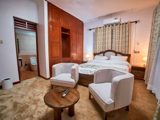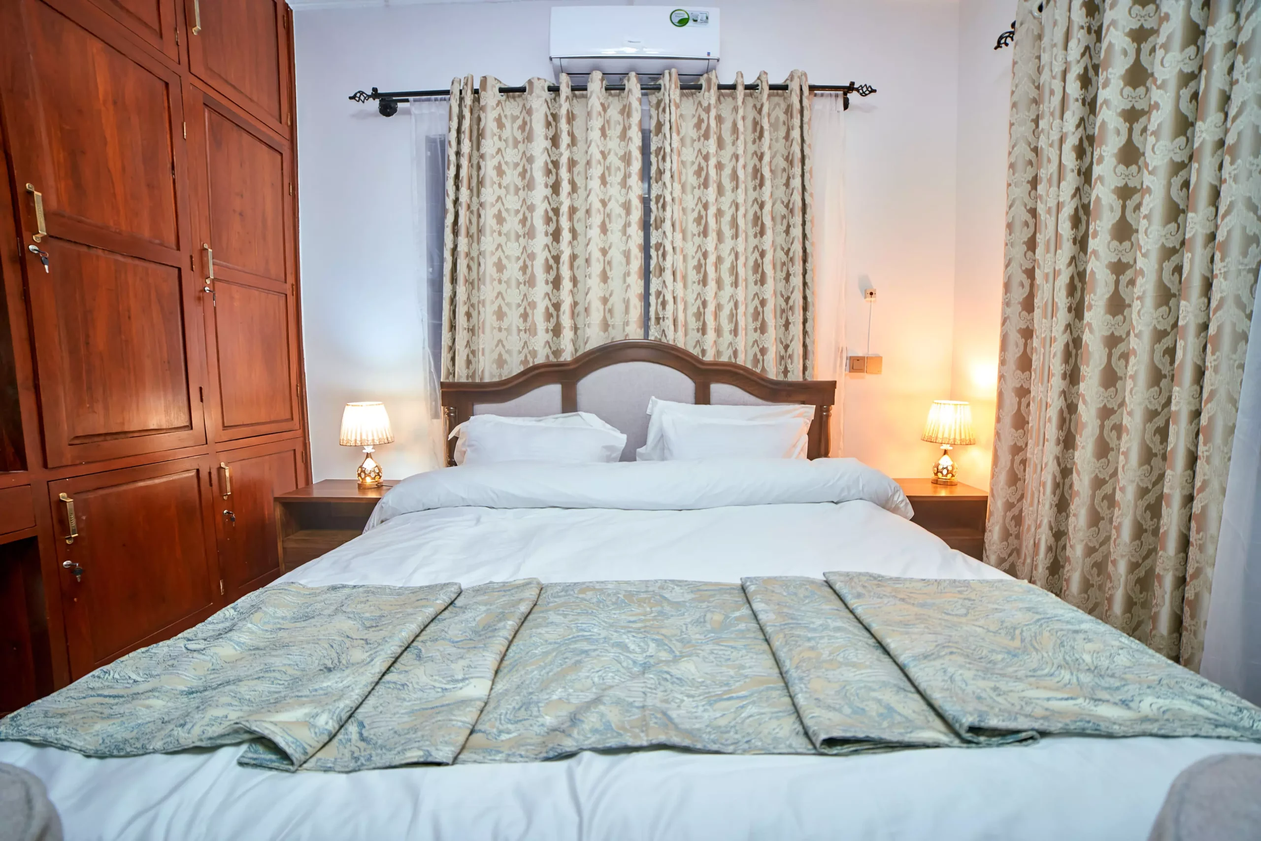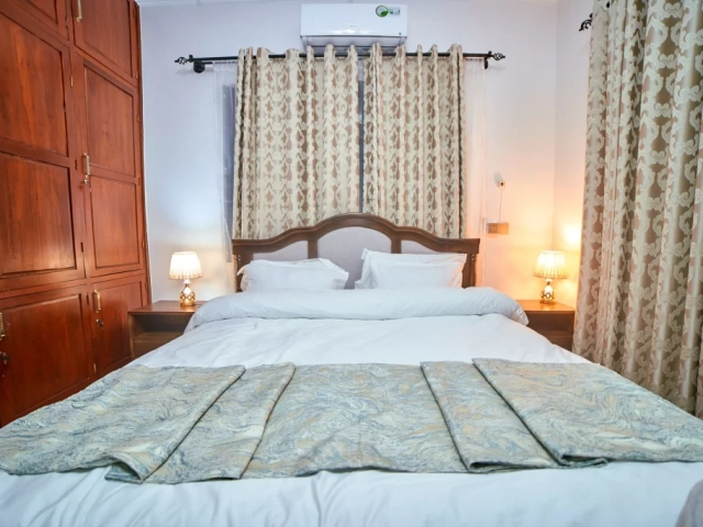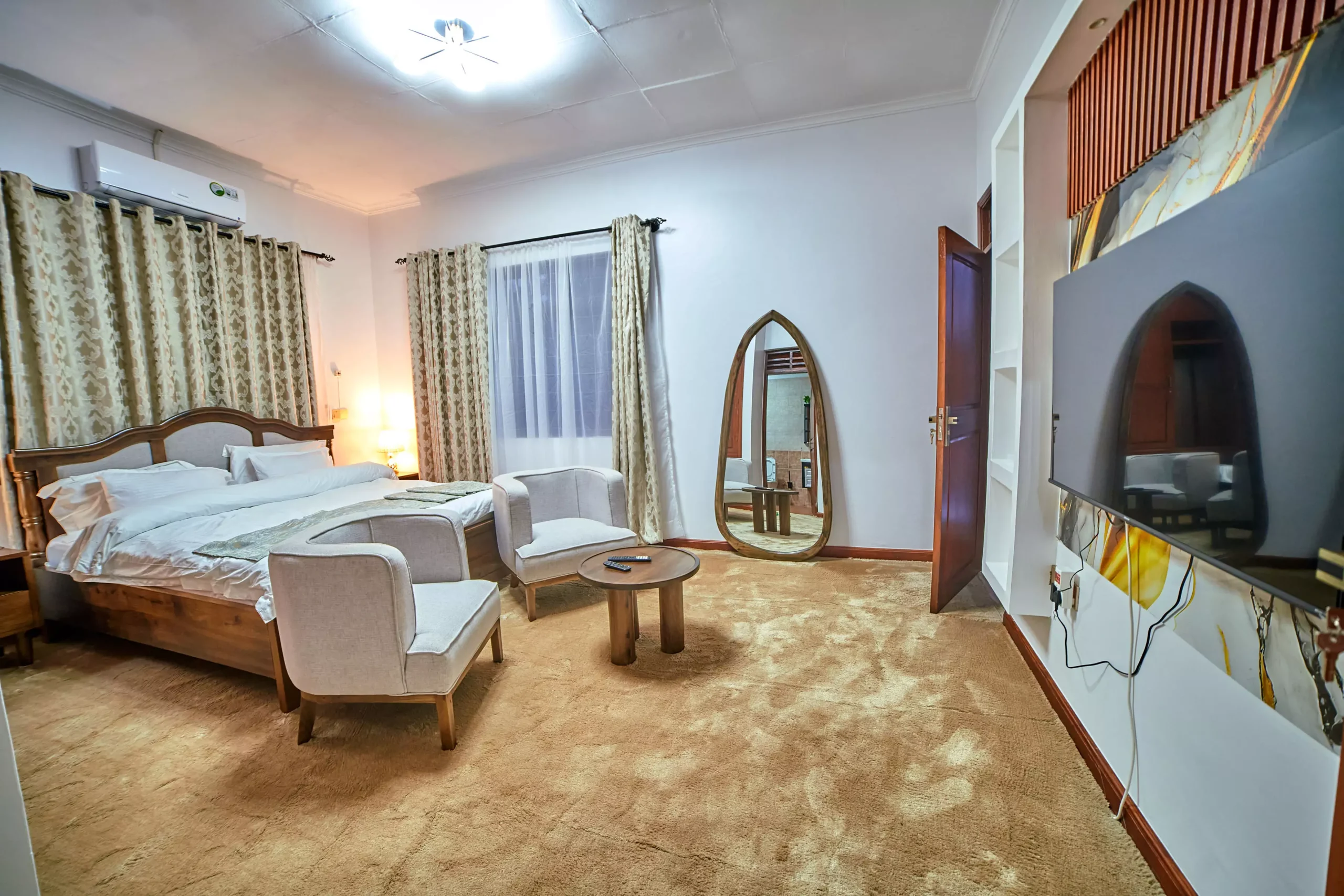 A spacious and beautifully designed room with a plush king-size bed, stylish décor, and ample storage.