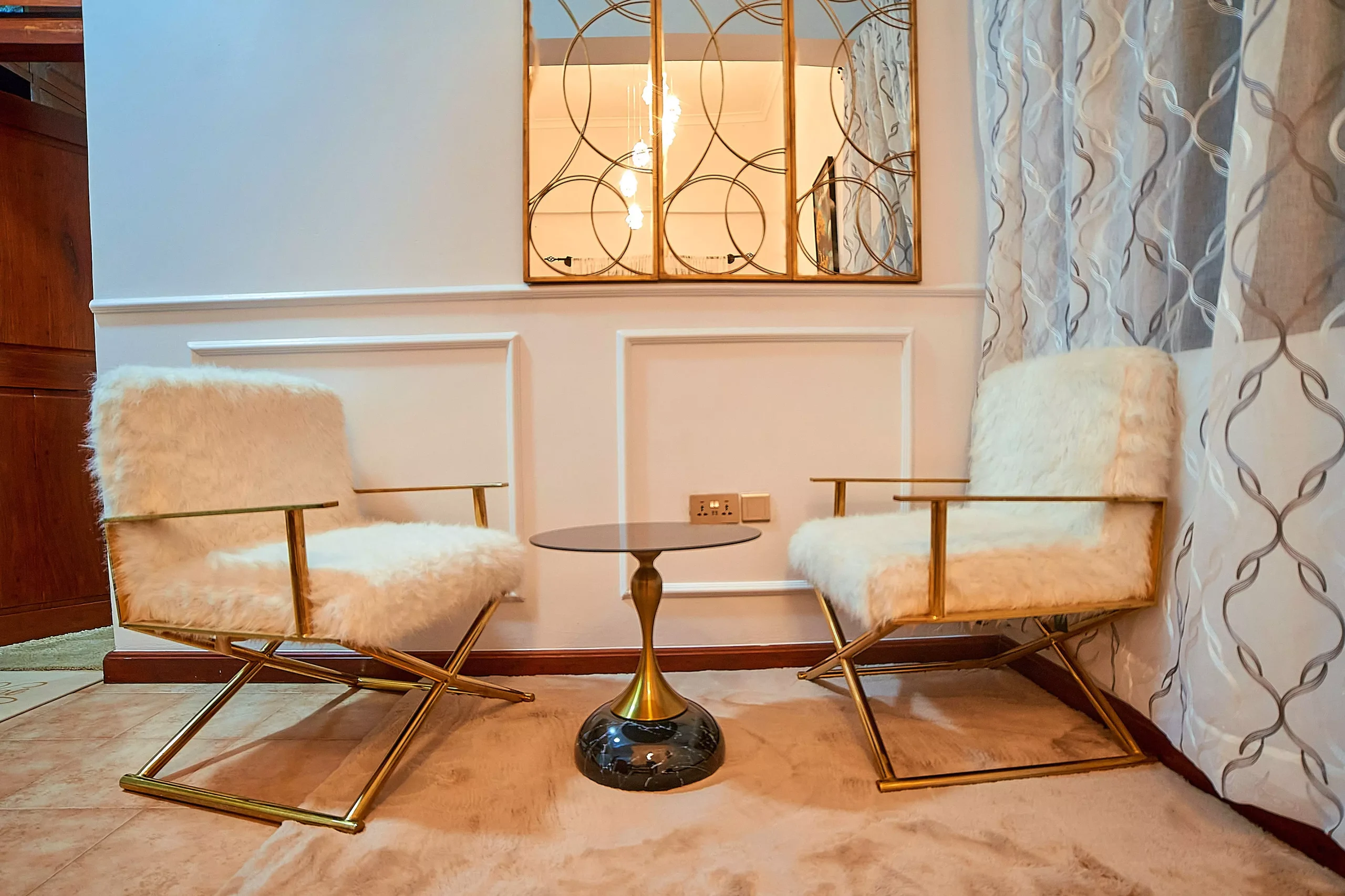 Featuring two cushioned armchairs and a warm wooden coffee table, your personal space for conversation, reading, or enjoying a minibar drink.